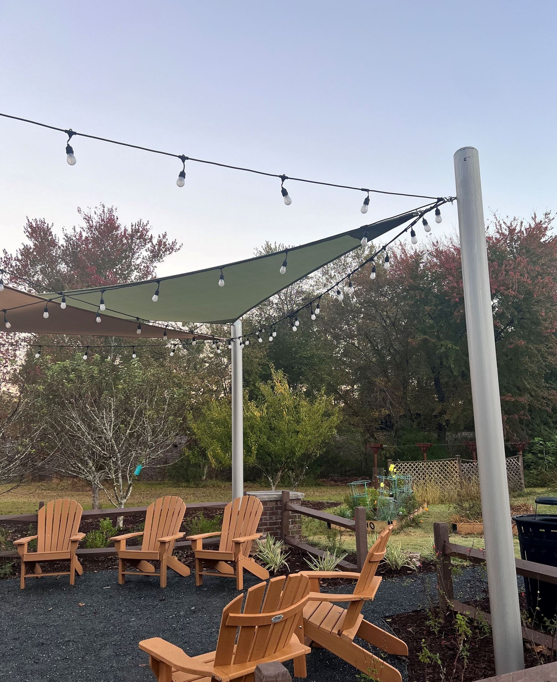 A cherry on top of the sundae for the Lilburn Community Garden beautification project — string lights now twinkle above the seating area!
