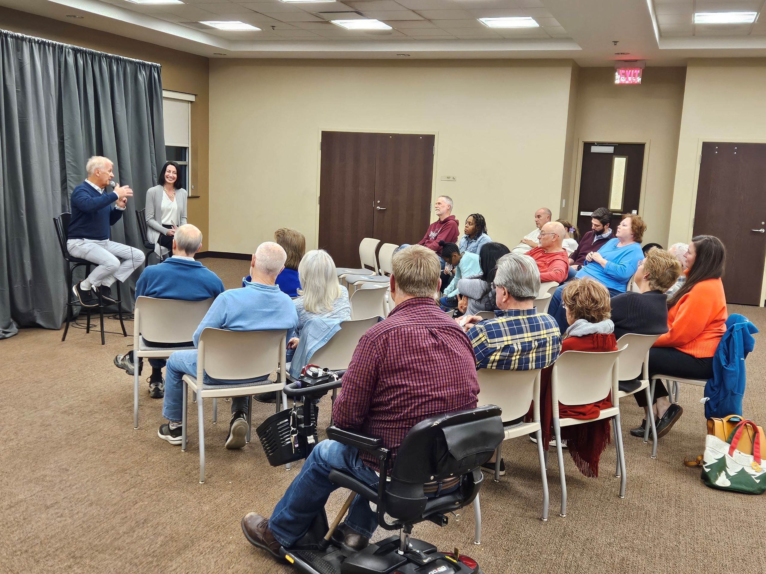 The Mayor and City Manager sat in front of an audience arranged in a semi-circle, and participants were encouraged to submit their questions anonymously on notecards. The City Manager then read the questions aloud with the Mayor providing responses.